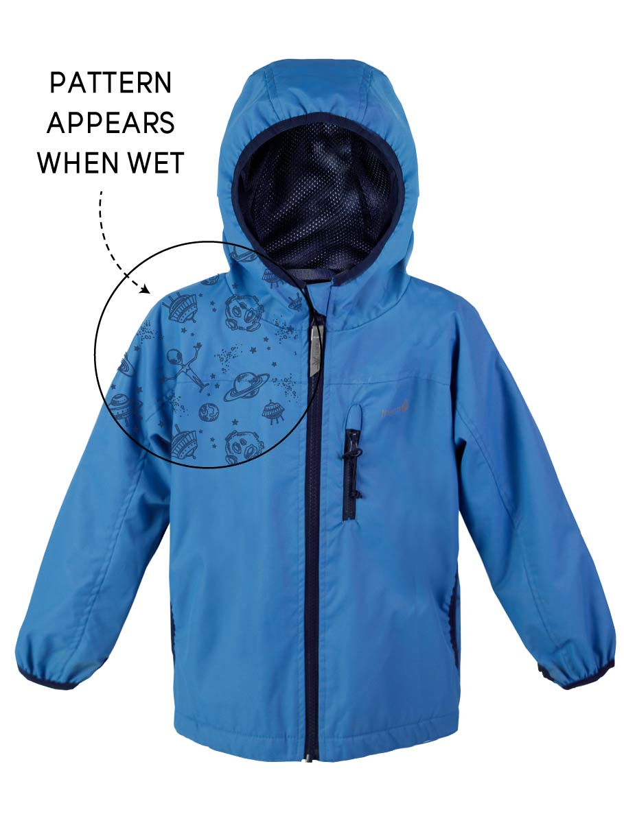 Kids cannot get enough of these SplashMagic rain jackets. Be prepared for them wanting to show anyone (and we mean ANYONE) the secret pattern appearing when their jacket gets wet!As well as having a cool SplashMagic pattern, these raincoats feature a 5,000mm waterproof outer shell, and are 100% windproof. Lightweight and easy wearing, with a soft mesh lining that kids love to wear. We have added thumbholes to ensure hand coverage in wind and rain, and fleece lined zipper pockets. Perfect for daily adventures and outdoor pursuits alike! When they do get wet and dirty, these awesome magic rain jackets are quick drying, and easy to throw in the washing machine and dryer (in fact the heat from the dryer preserves the water repellent teflon coating).