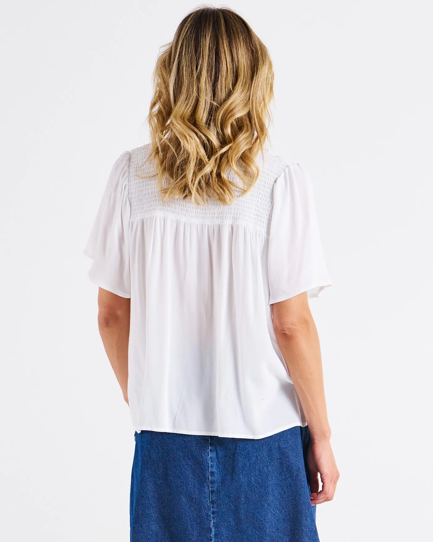 The Sandy Shirred Blouse is a perfect blend of comfort and style. With a soft viscose feel, button-up front, and flutter sleeves, this blouse features a front and back shirred yoke for a relaxed, wearable look.