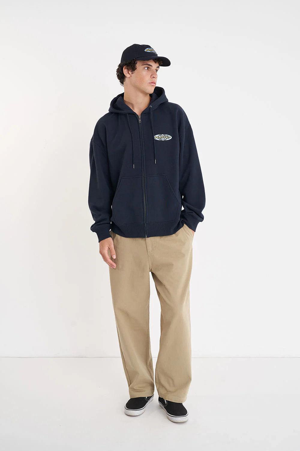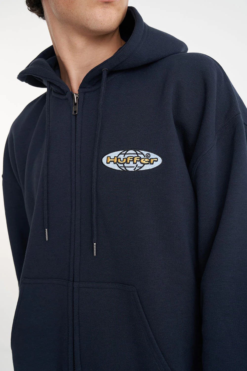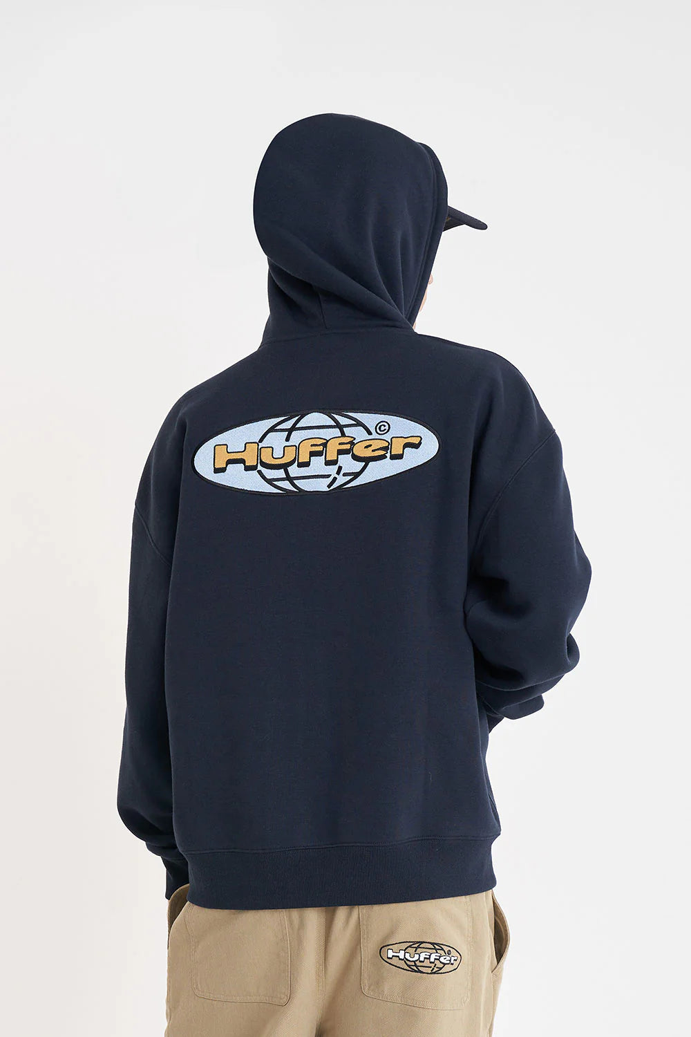 60% Cotton 40% Polyester / 350gsm / Mid-weight brushback fleece / Custom Huffer colour / Boxy fit / Kangaroo pocket / Huffer branded hardware / Huffer branded placement applique
