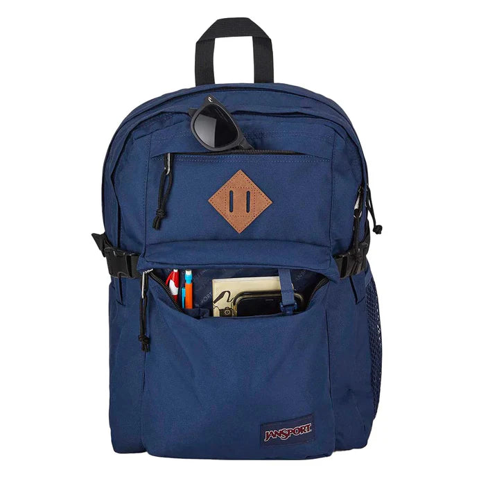 The Main Campus backpack was made to be put into high gear. Featuring a padded laptop sleeve, a large main compartment (plus a secondary compartment with an organizer panel), a side water bottle pocket, and a front organizer compartment. The Main Campus was made for heavy duty hauling with side compression straps and ergonomic shoulder straps to take a load off your back. This pack is great for high school and university students hauling extra-long days of classes Padded laptop compartment - built in padded compartment to protect a 15inch sized laptop, perfect for classes with bring-your-own-device Elastic side water bottle pocket - stretches to fit most bottles so you can keep hydrated on the go with an easy to access drink bottle. No need to sacrifice internal storage space just for your water Padded S-Curve shoulder straps - designed to mimic the shape of your body, protecting your shoulders so you'll be able to carry your gear in comfort all day long Fully padded back panel - keeps oddly shaped items from creating pressure points on your back while providing added comfort Webbed haul handle – lets you hang your backpack on a hook when you don't need it, and grab it in a hurry for when you do Two large main compartments - provide up to 32 litres of storage for your gear and keeps it tidy Side compression straps - when carrying less gear, side compression straps allow the contents of your pack to be squeezed closer to your body for improved weight distribution and a more supportive carry Front zippered stash pocket with lash tab - creates quick and easy small-item storage along with an external patch perfect for attaching carabiners or bike lights Front pocket with organizer panel and key fob - made for storing smaller essentials and keeping keys easily accessible Backpack liner update - the colour of internal liners may vary due to a transition to a darker colour 100% Recycled Polyester 600 Denier - by using main body fabric made with recycled polyester, it reduces our impact on climate change compared to virgin polyester For more than 50 years, JanSport has designed packs that last, to go everywhere you go and carry what you need. We stand by the quality and durability of every pack we make - and since we have been doing that since 1967, every JanSport is backed by our Limited Lifetime Warranty.