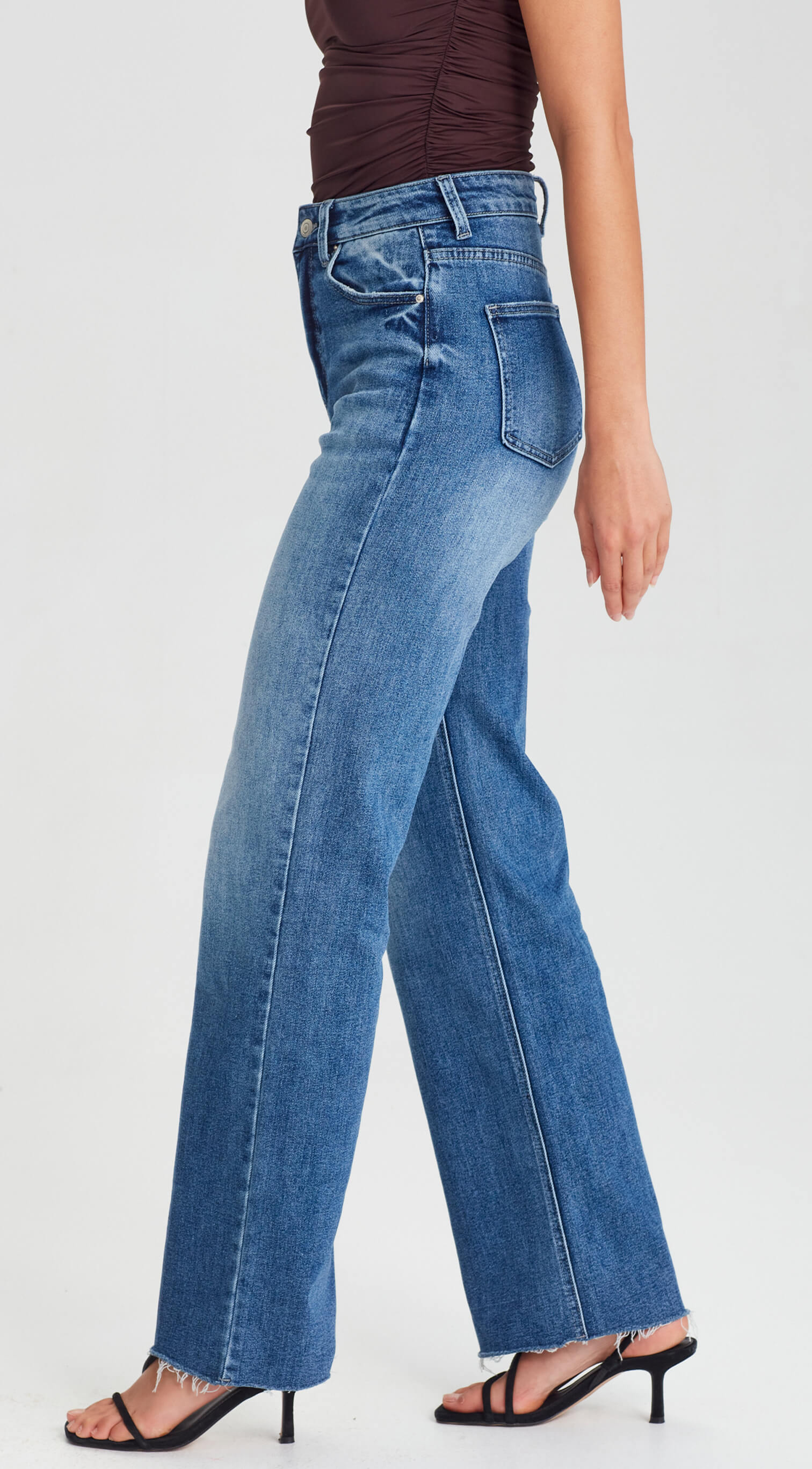 Alanis wide leg jean that fits slimmer to the waist & body with a relaxed leg and wider raw hem that can be cut to length. In a medium stretch, premium denim and perfect denim blue colour.