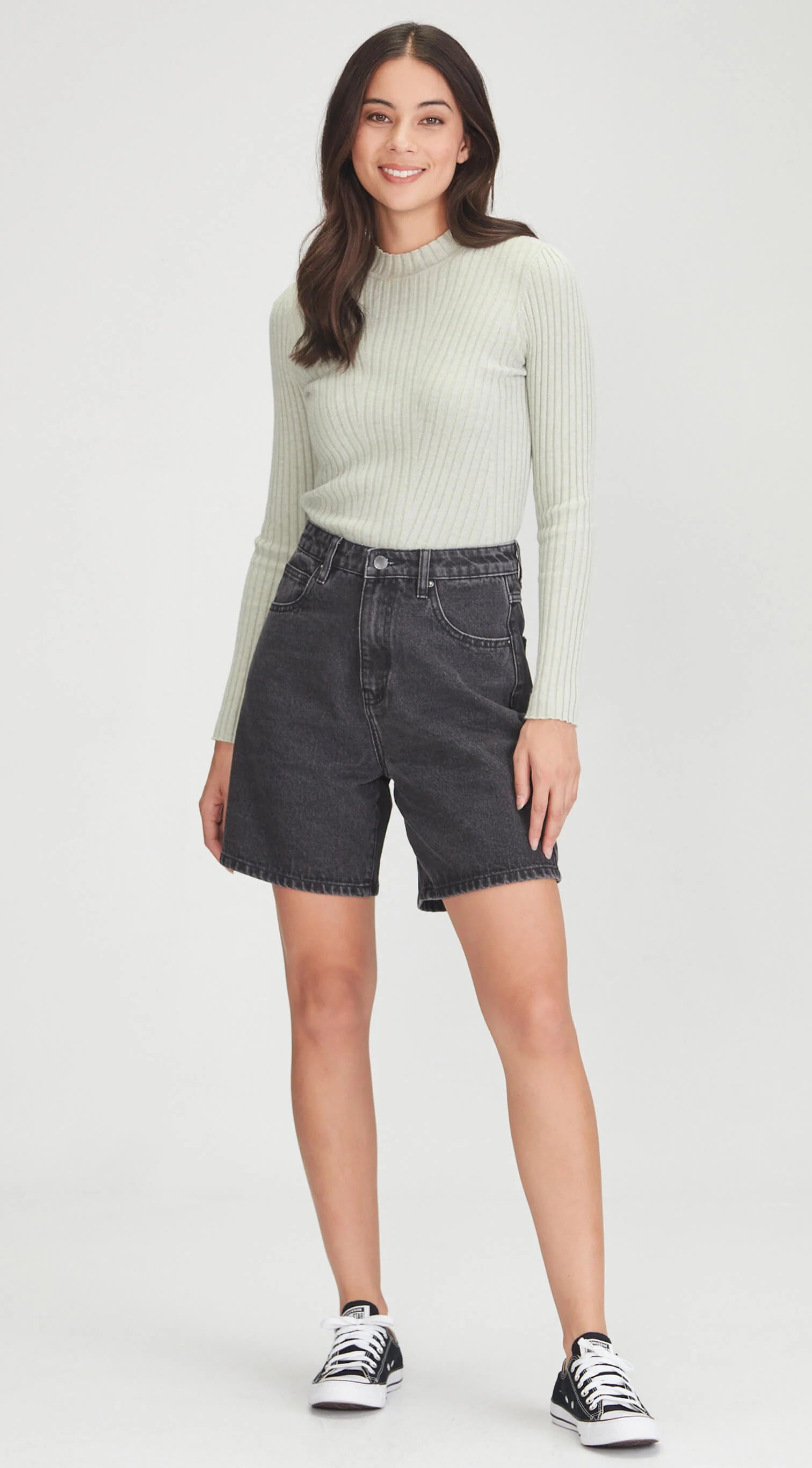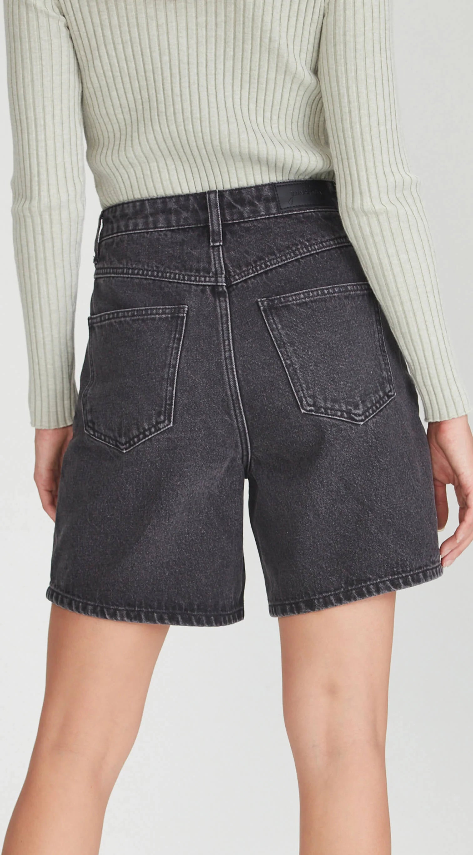Mid/high waisted rigid denim A line denim shorts.