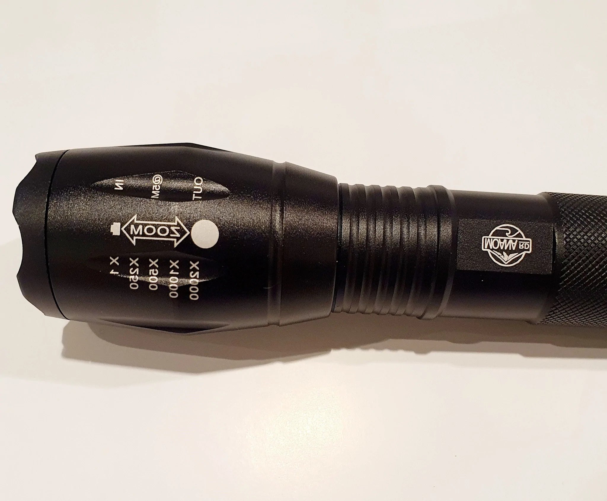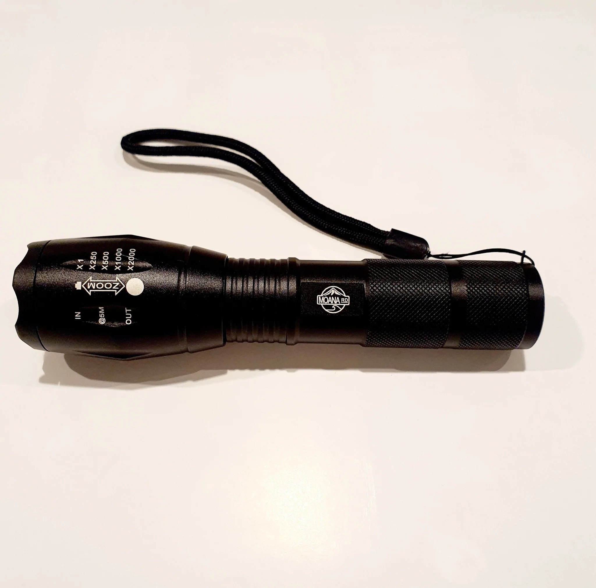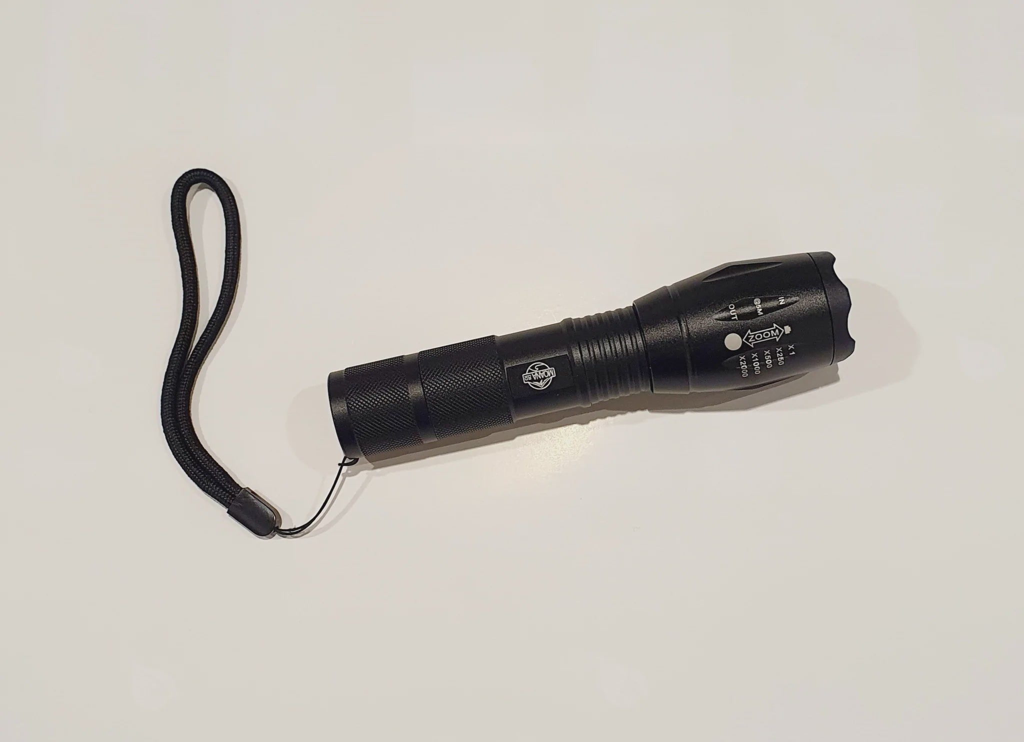 The Torch is ultra bright (350 lumens) and has an adjustable focal length so you can narrow and concentrate the beam of light by pulling up the shaft. The body is made of aluminum with a grip handle and a wrist strap. It requires 3 x AAA batteries that are not included.