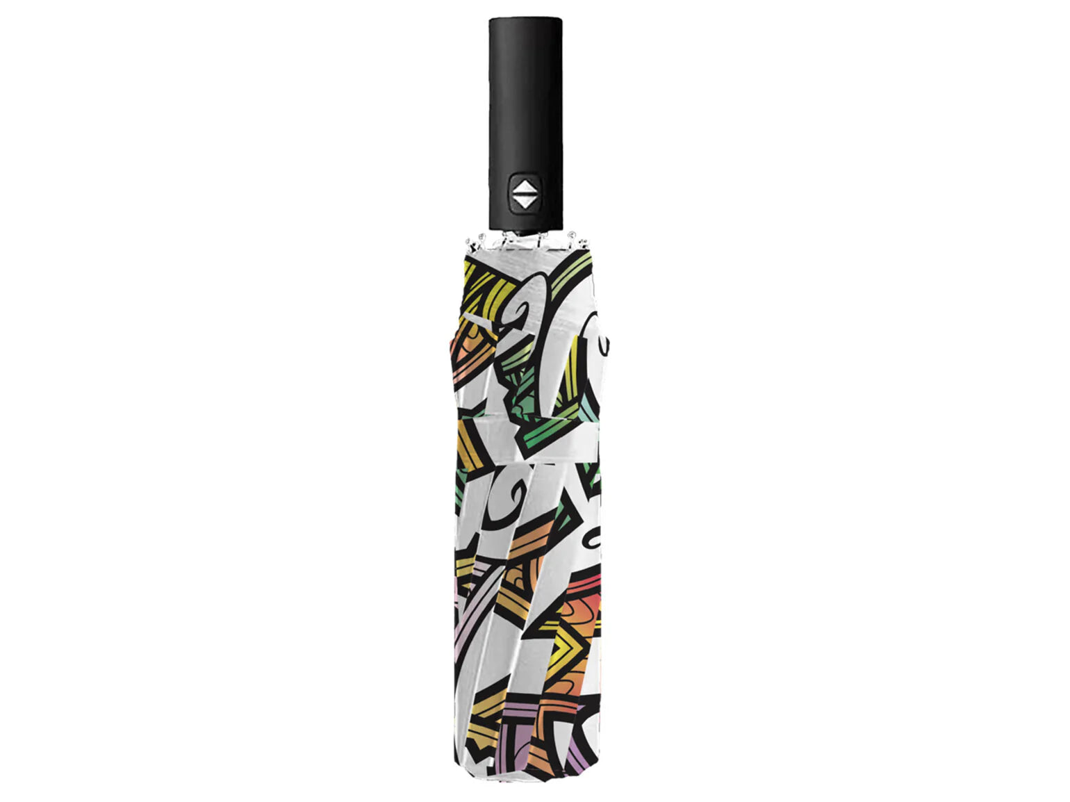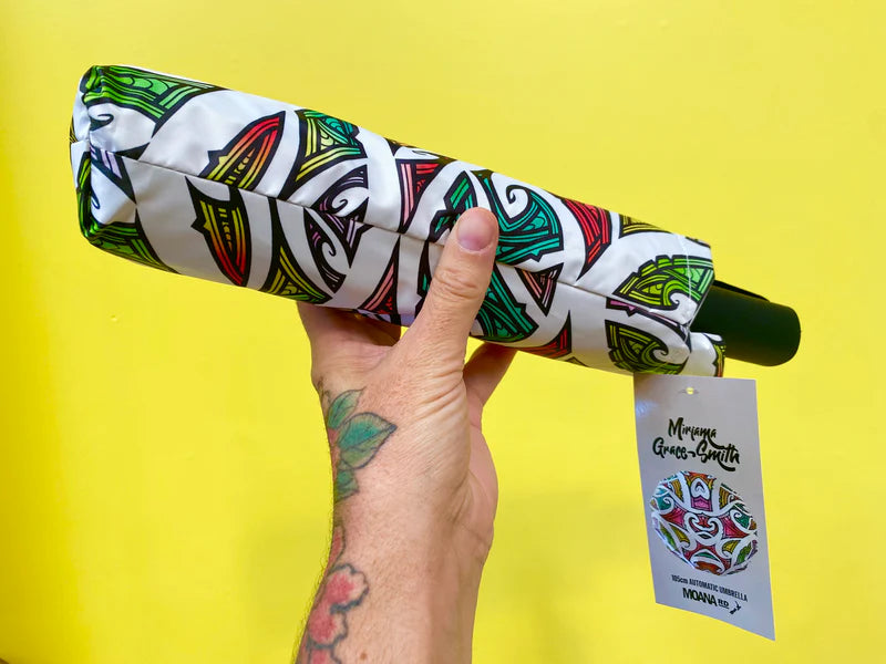 This stunning umbrella is a design collaboration between Aotearoa creative Miriama Grace-Smith (Ngāti Hau, Ngāti Maniapoto, Ngāti Toarangatira and Ngāti Porou) and Moana Road.