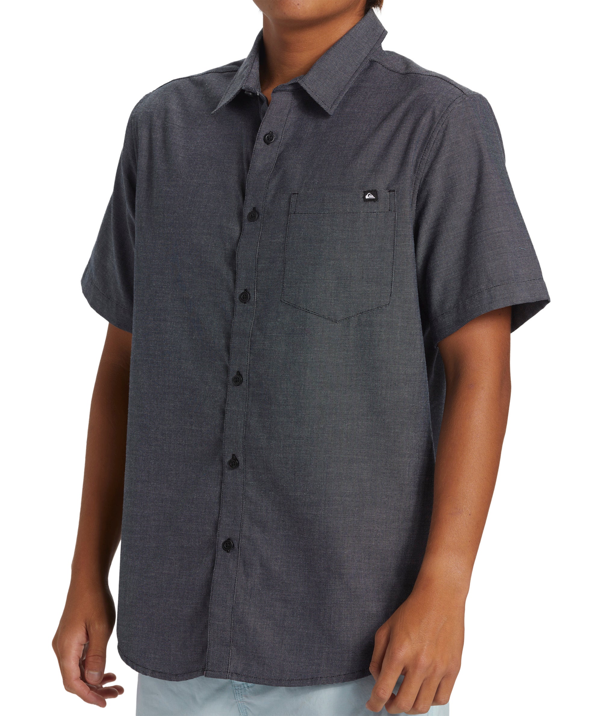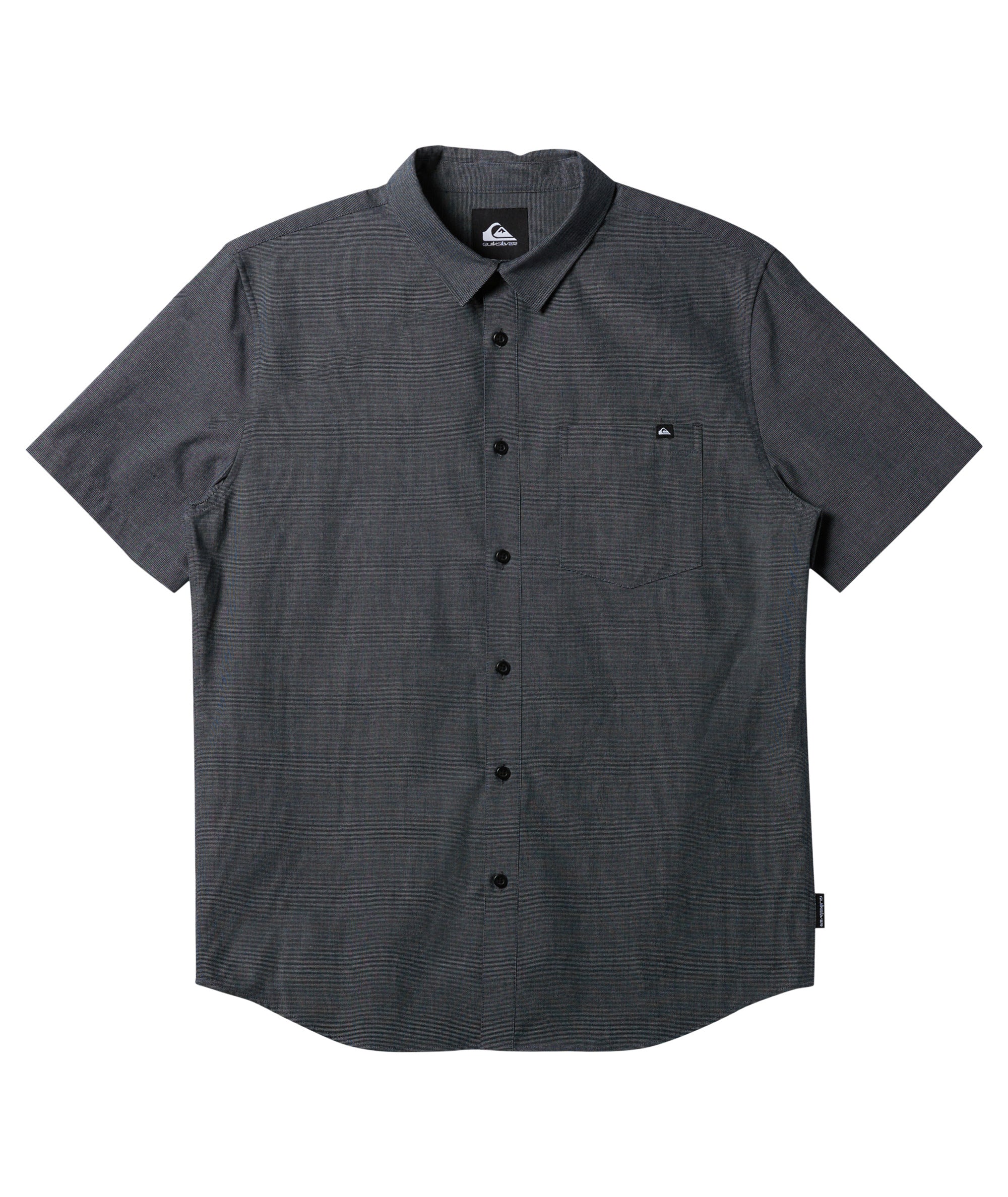 Experience ultimate comfort with the Shoreline Short-Sleeve Woven Shirt from Quiksilver. Crafted from a blended cotton weave fabric, this shirt features a regular fit, classic collar neck, short sleeves, single chest pocket, button closure, and scalloped hem. Branding is supplied through the Quiksilver woven label on the chest pocket and side seam. Featured here in the Dark Navy colorway.
