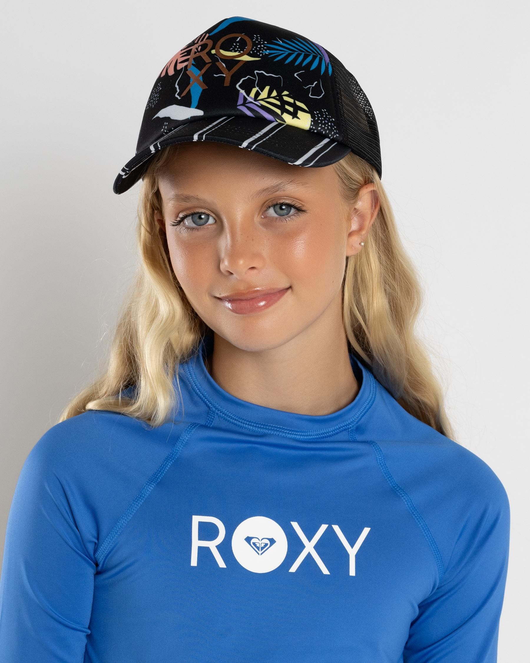 Trucker Cap for Girls. Features include: Fabric: Polyester fabric, Construction: 6-panel "J shape" construction, Adjustable back closure, Mesh-backed design, Brim: Curved visor, Cotton ROXY patch, Size: 20.8" / 53 cm Ø.