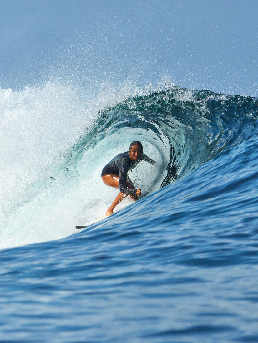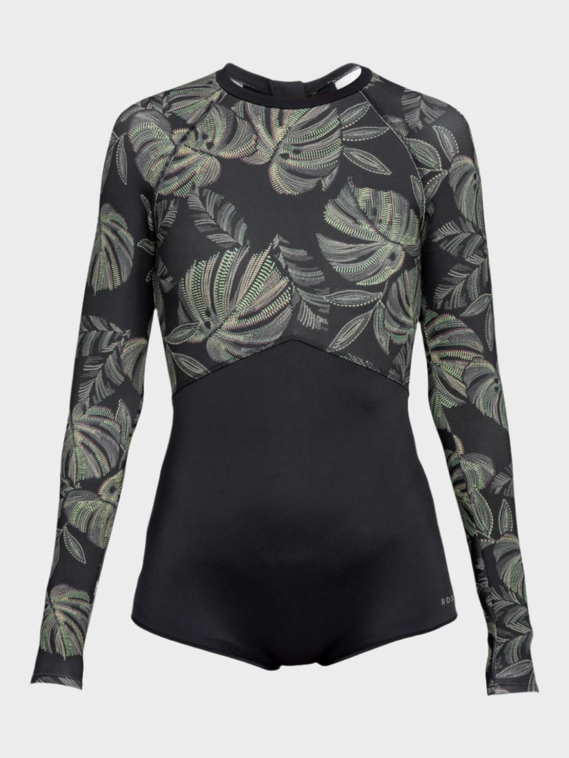 The Roxy Pro Wave Long Sleeve 1pc Swimsuit – Anthracite/The Palms is a slightly thicker neoprene than your normal rashvest material. It will give you a bit more warmth than a swimsuit or a rashvest.