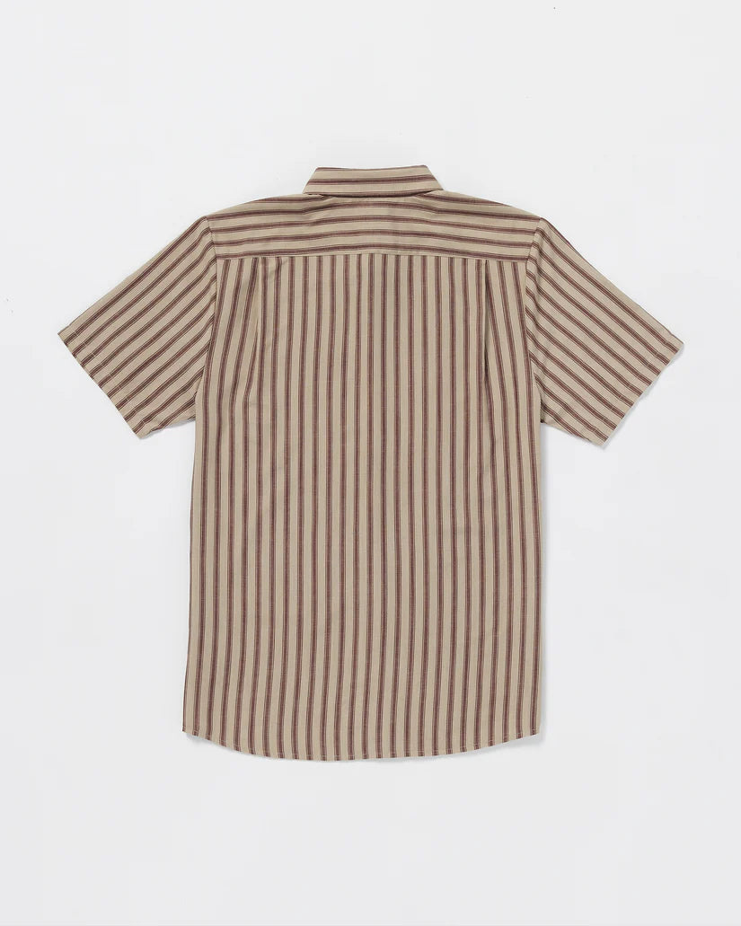 This woven short sleeve button-up features a unique yarn-dyed stripe pattern in a versatile khaki hue. Cut for a relaxed, classic fit, it's ideal for everyday wear thanks to details like a chest pocket, branded label, and custom faux horn buttons. Made from a breezy polyester/viscose blend.