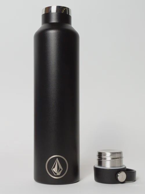 Stainless steel bottle with double-wall insulation keeps drinks hot or cold. Powder-coated 25 oz design includes leakproof lid, carry loop, and laser-etched branding. Sweatproof and BPA-free.