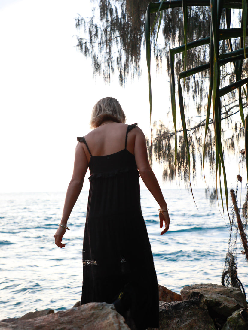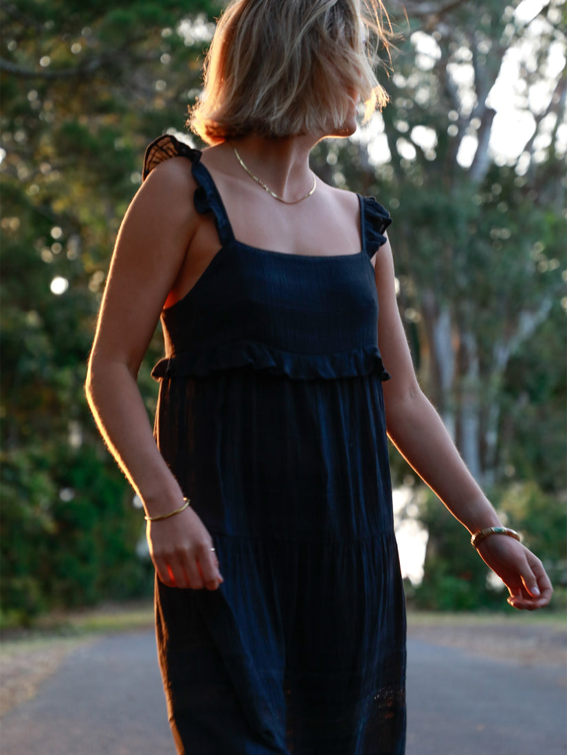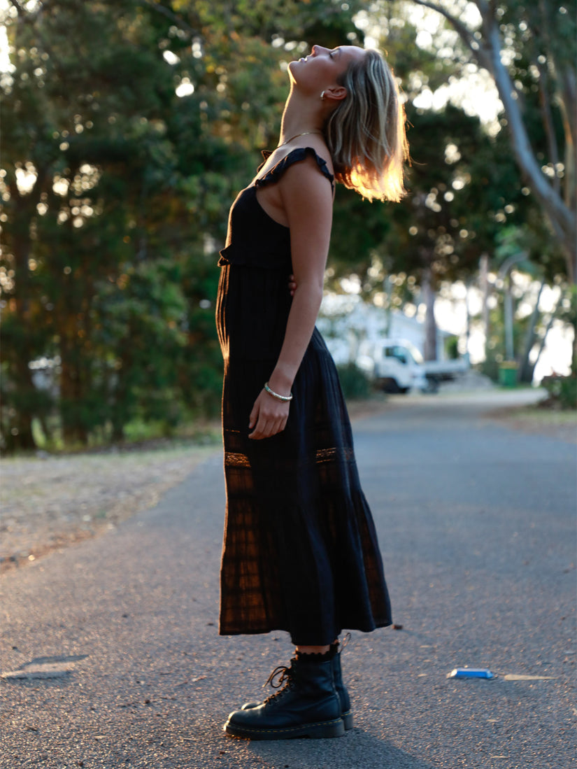 Lightweight cotton/viscose blend meets boho chic in this breezy, tiered maxi dress. Frill under bust, adjustable straps and lace trim lend feminine flair to the relaxed, flowy silhouette. Dress up or down for effortless warm-weather style.