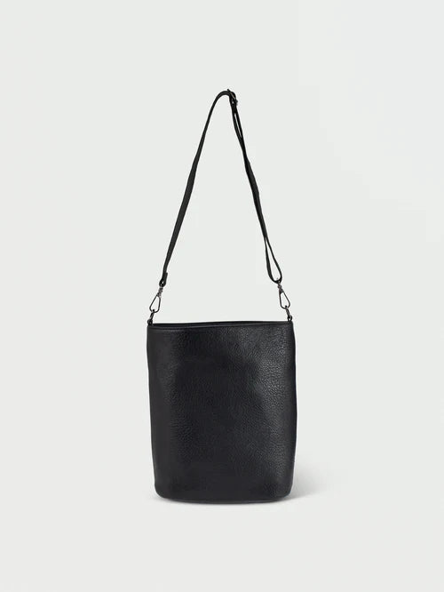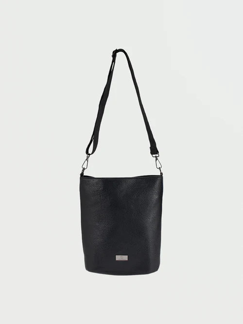 Sleek pebbled polyurethane blend shoulder bag with handy interior pockets. Adjustable strap allows custom carrying; magnetic closure offers easy access. Branded metal logo badge elevates everyday style.