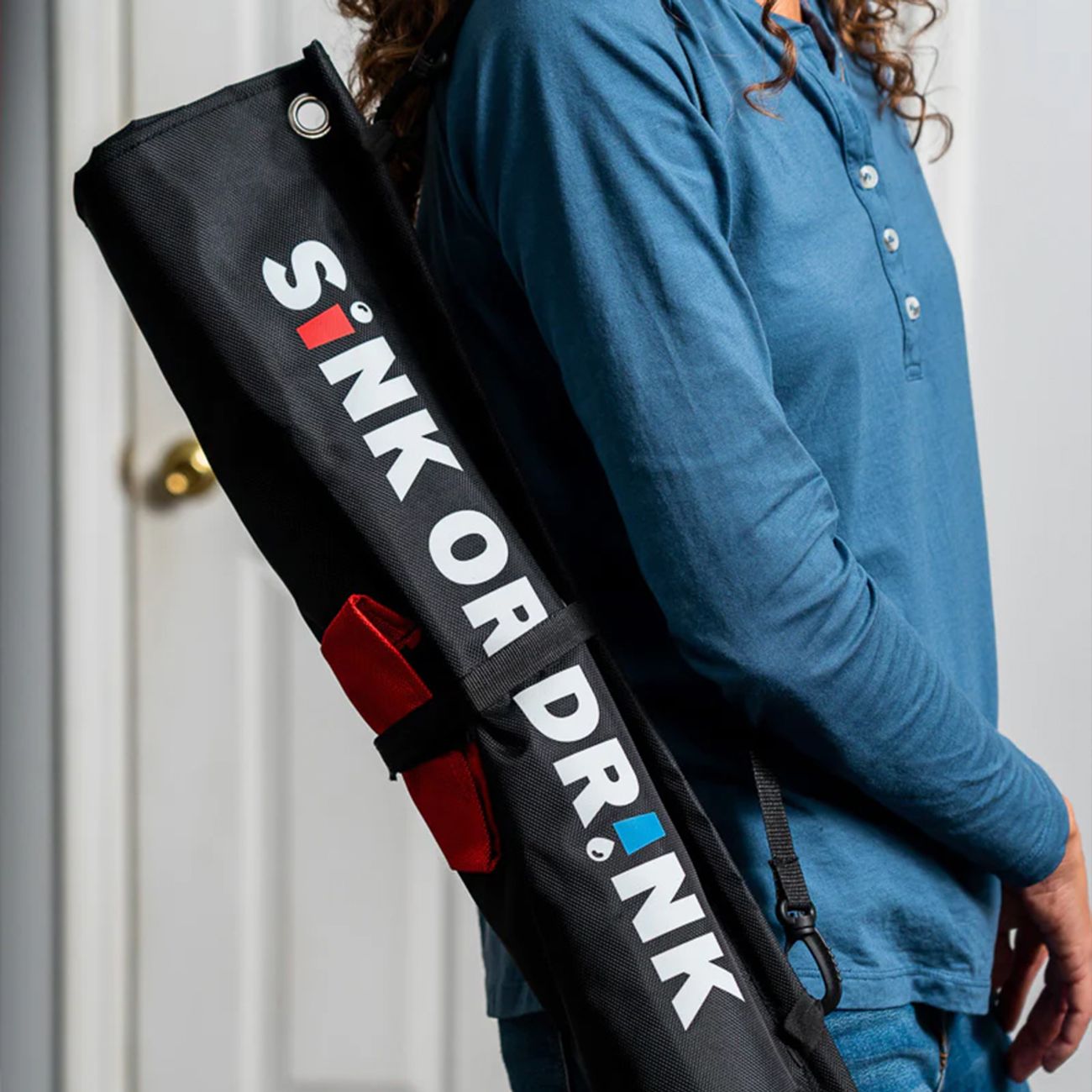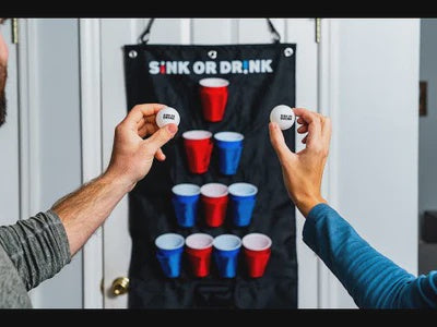 Rethink the way you play beer pong! Sink or Drink is a hangable beer pong target with color-coded cup holders for teams. Forget setting up a table. Play vertically to save space! Sink or Drink easily hangs on the back of doors (hooks included), cars, or any way you can get creative. * Set includes 10 party cups, 2 ping pong balls, and 2 door hooks.